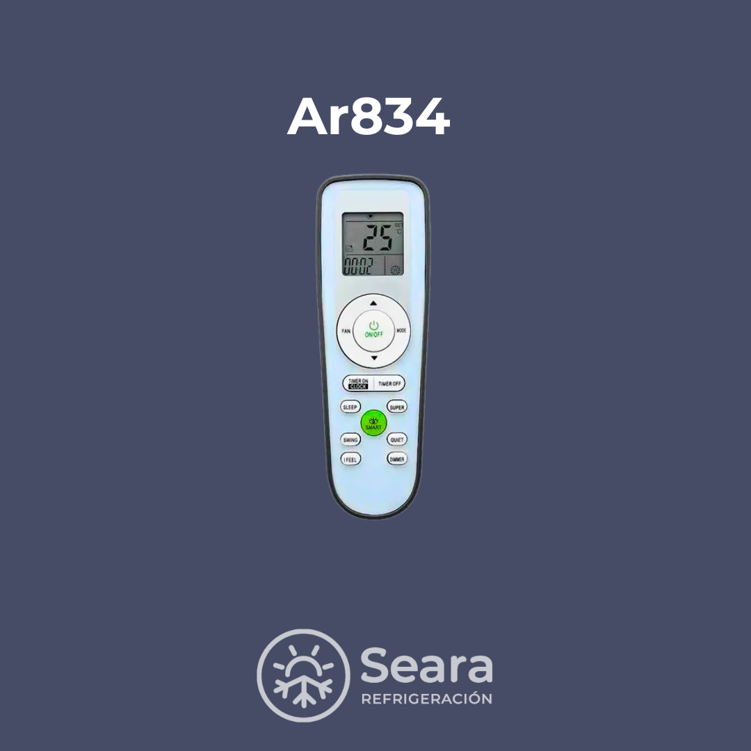 El AR834 es un control remoto diseñado como reemplazo específico para aires acondicionados York, permitiendo recuperar todas las funciones del equipo sin necesidad de códigos o configuraciones adicionales.